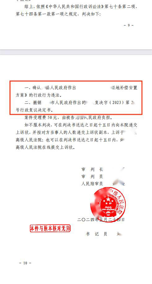 2024年5月24日,山东省聊城市中级人民法院经审理作出(2024)鲁15行初44号《行政判决书》,一审判决确认x县人民政府作出的《补偿安置方案》违法,撤销聊城市人民政府作出的第315号《行政复议决定书》,委托人的合法权益得到了初步维护。